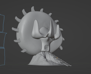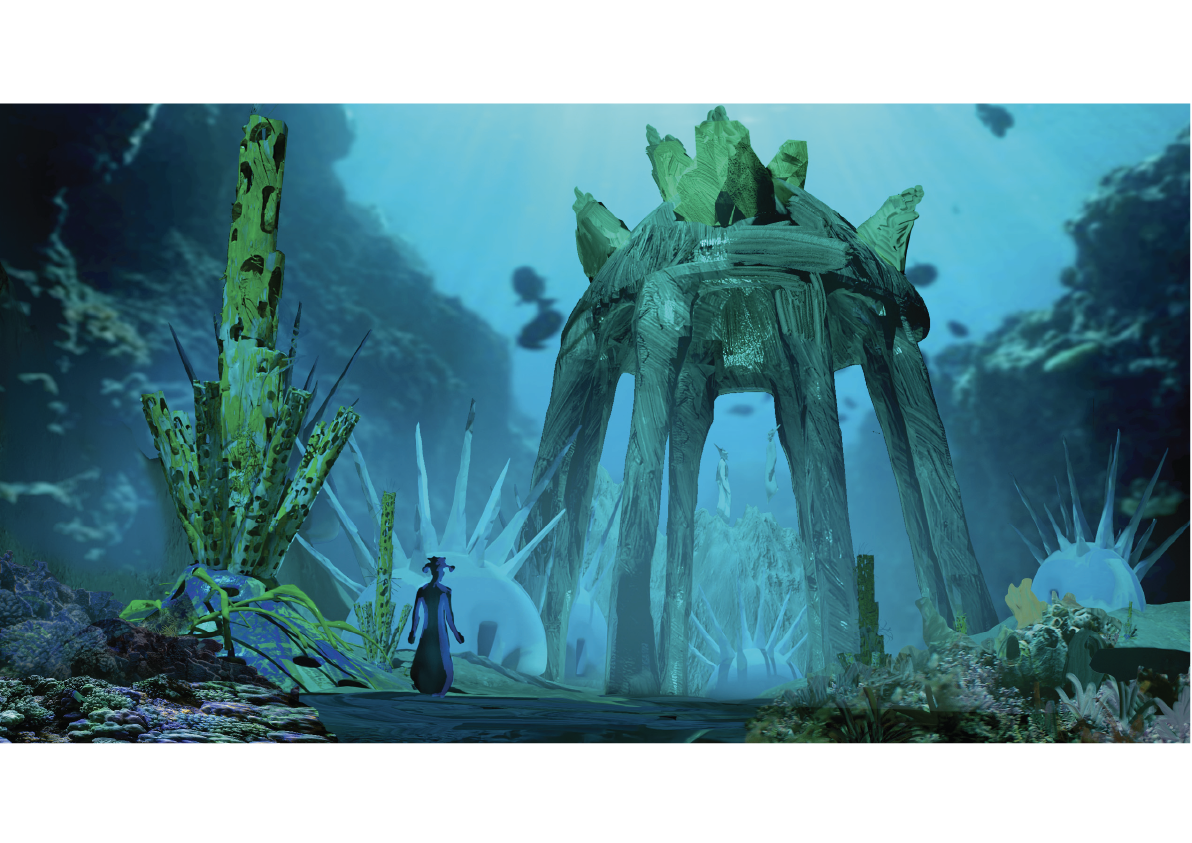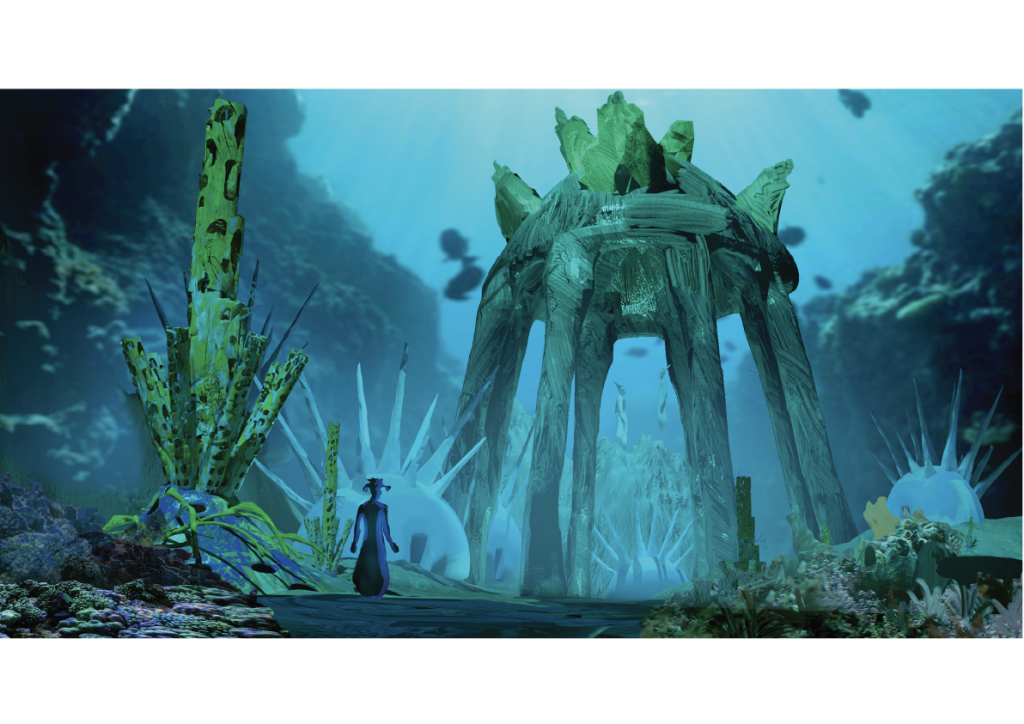 In this illustration I create a undersea world where the architecture id adorned with spikes on its roof to keep the sharks away .